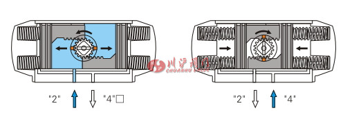 當氣源壓力從氣口(2)進入氣缸兩活塞之間中腔時,使兩活塞分離向氣缸兩端方向移動,兩端氣腔的空氣通過氣口(4)排除, 同時使兩活塞齒條同步帶動輸出軸(齒輪)逆時針方向旋轉。反之氣源壓力從氣口(4)進入氣缸兩端氣腔時,使兩活塞向 氣缸中間方向移動,中間氣腔的空氣通過氣口(2)排除,同時使兩活塞齒條同步帶動輸出軸(齒輪)順時針方向旋轉。 (如果把活塞相對反方向安裝,輸出軸變為反向旋轉,即為雙作用反轉型)
